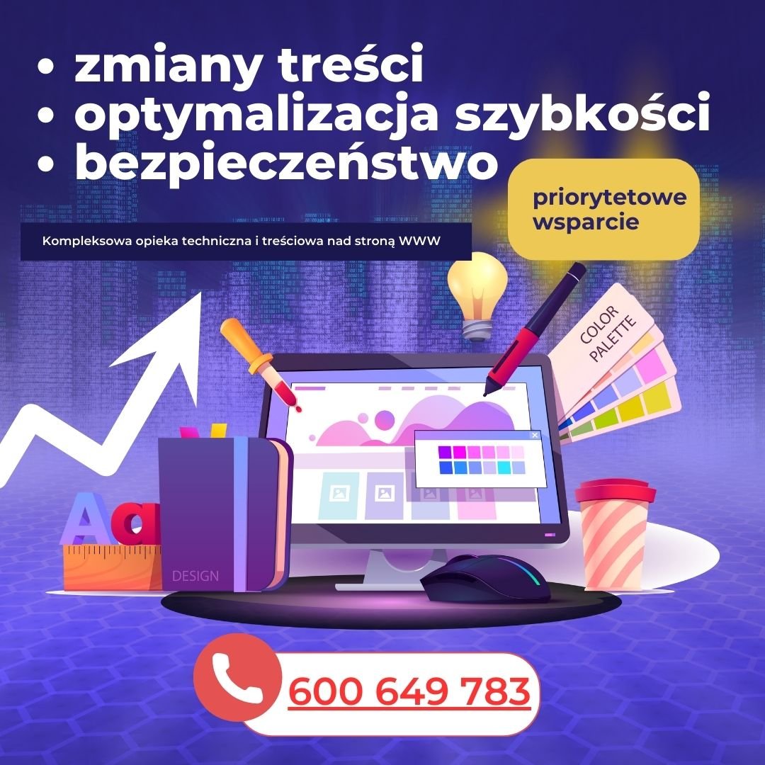 Kompleksowa opieka techniczna i treściowa nad stroną WWW: priorytetowe wsparcie, zmiany treści, optymalizacja szybkości oraz pełne bezpieczeństwo.